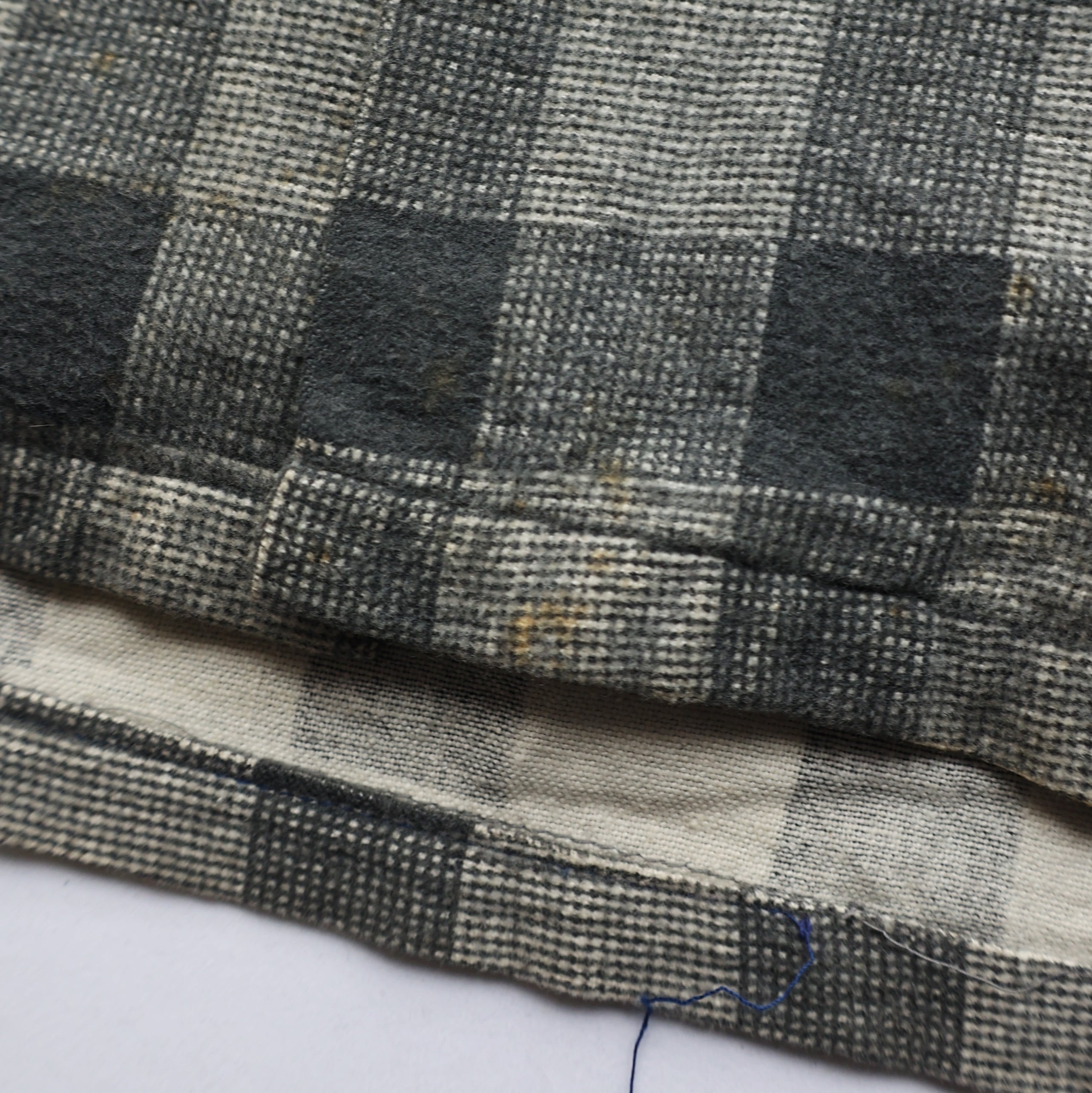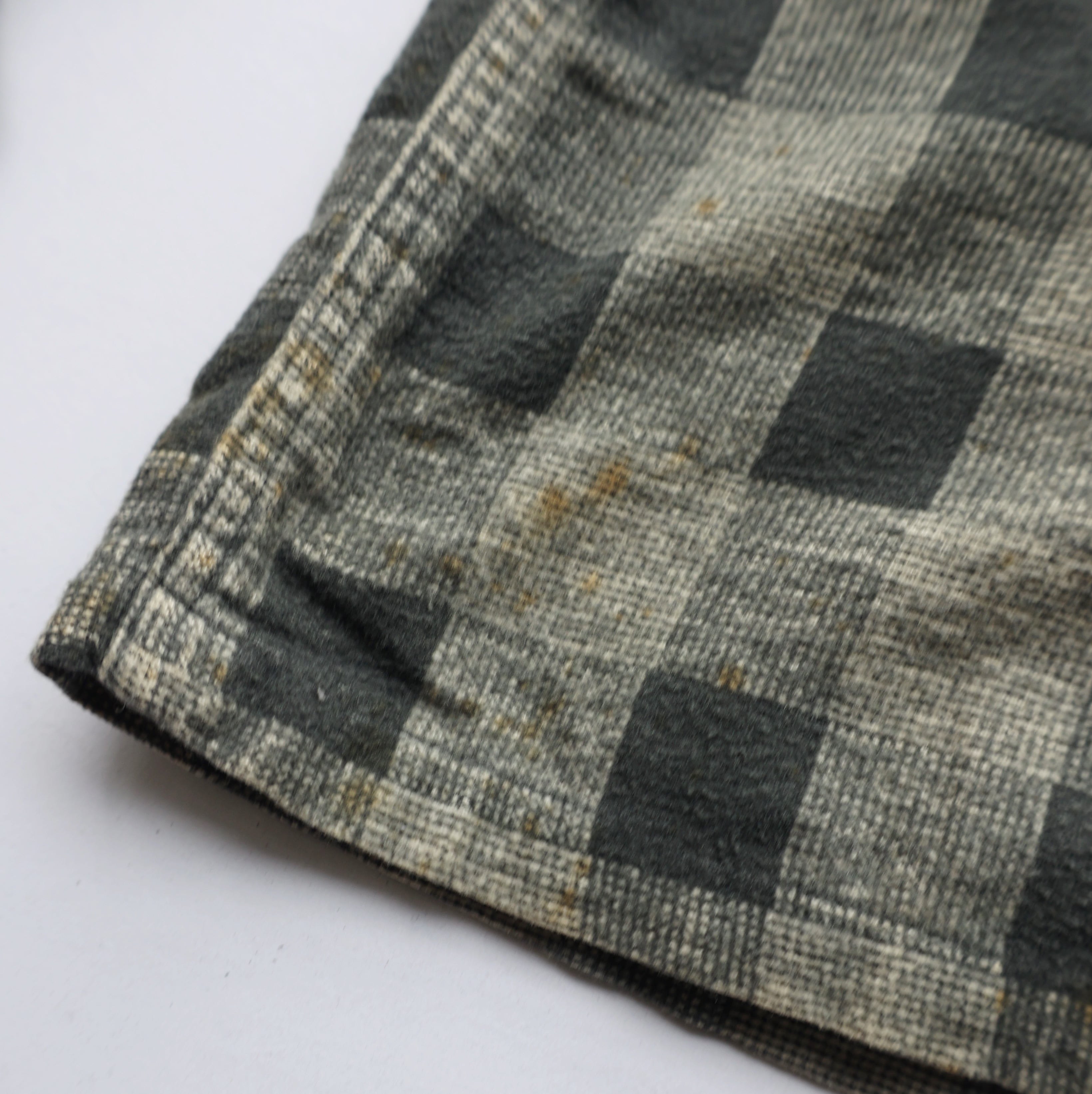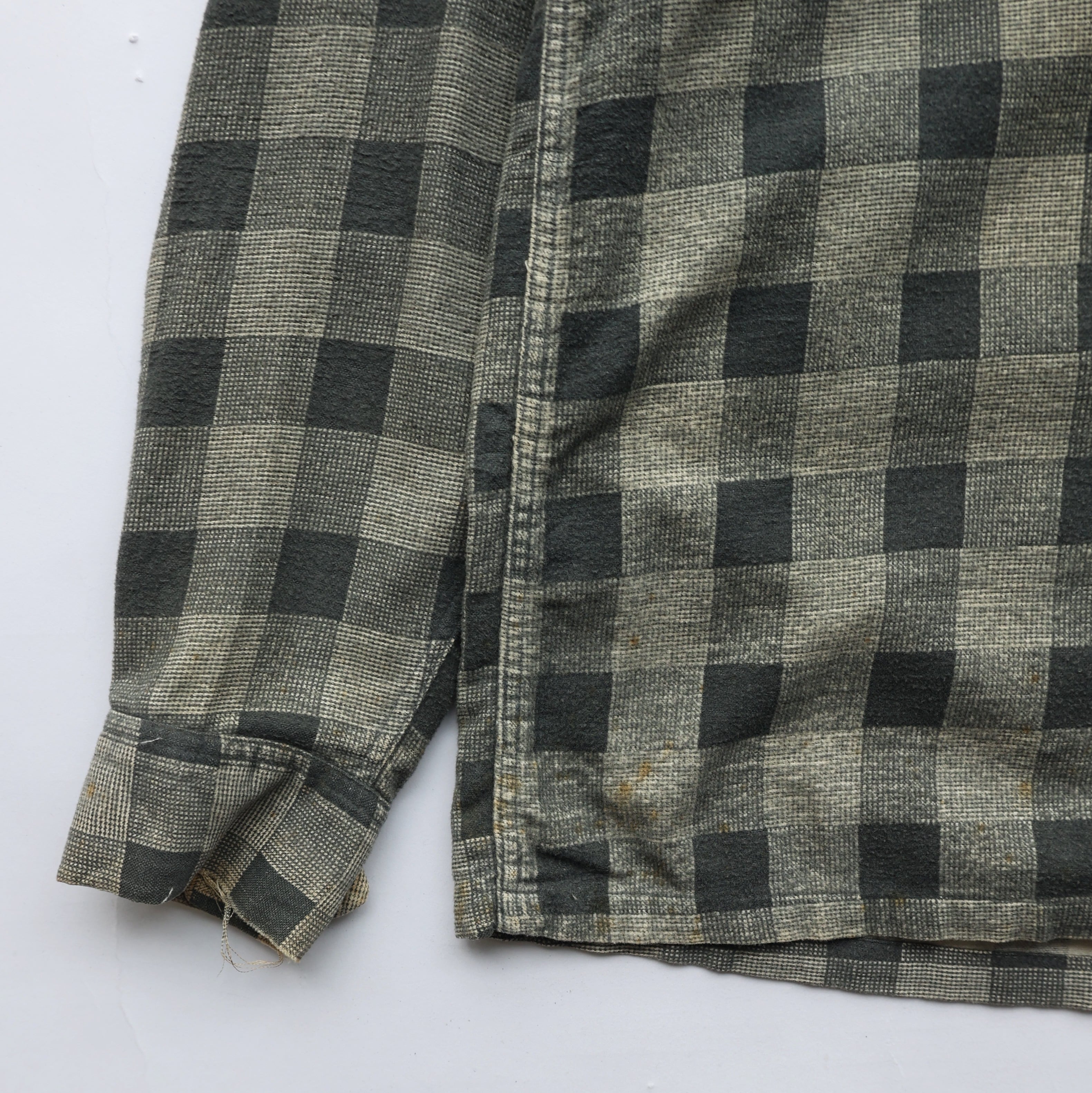 襟付近、フロント上部、下部、両袖先、バック中央に汚れ有り