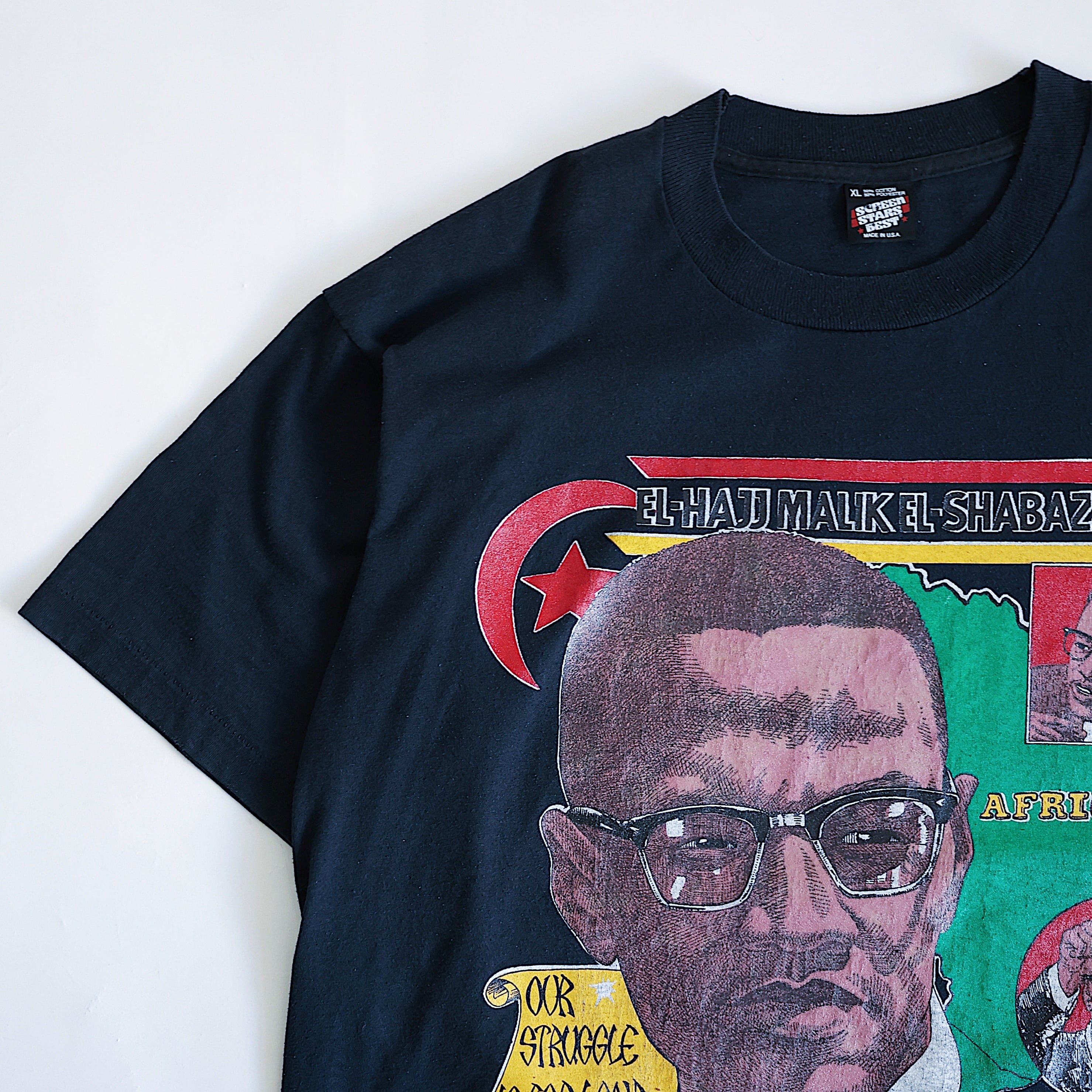 フロント上部に書かれている[EL-HALL MALIK EL-SHABAZZ]とは彼がイスラム教徒として巡礼を行った後に改名した名前です。バックには大きくイスラム教のシンボルである赤・黄・緑の三色旗がプリントされています。